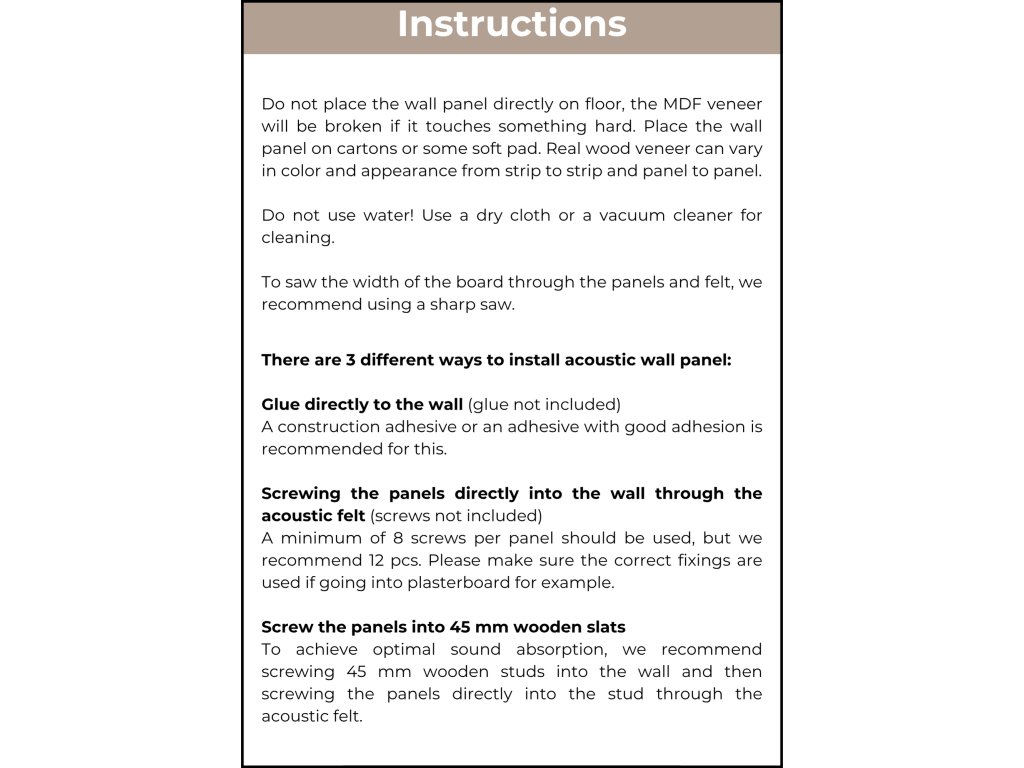 1. Montáž lepením Pro rychlou a čistou instalaci naneste na zadní stranu filcu montážní lepidlo (např. Mamut) a panel pevně přitlačte ke stěně. |